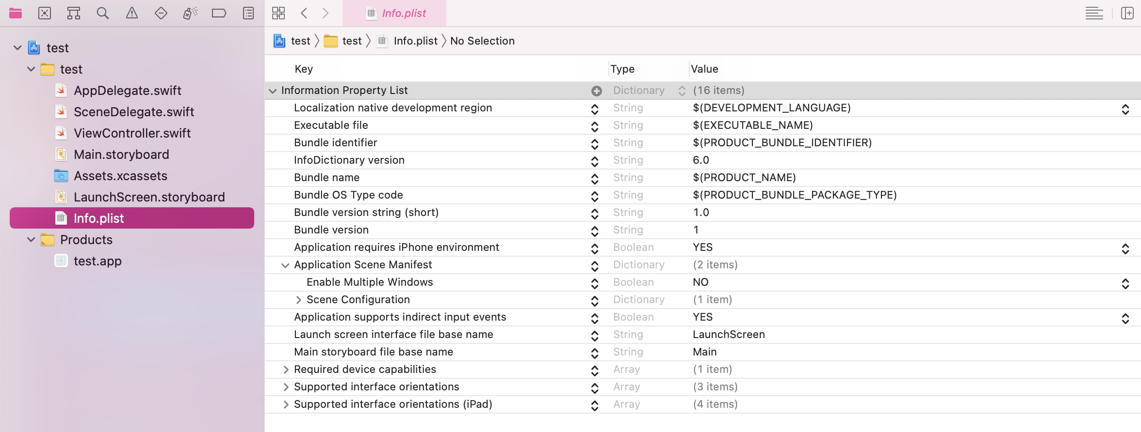 사진 맨 윗 부분에 Key, Type, Value를 확인할 수 있으며, 시스템은 이 키와 값을 사용하여 앱과 앱의 설정을 가져옵니다. 즉, 플러그인, 프레임워크, 앱에 Info.plist가 있어야 합니다.