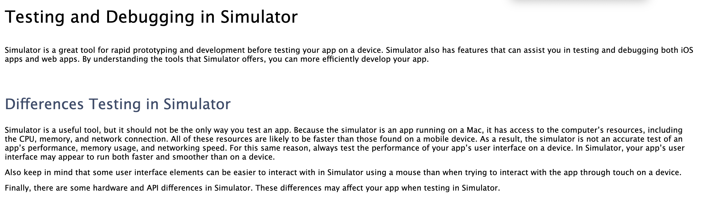 시뮬레이터는 Mac 기반에서 돌아가기 때문에 컴퓨터의 자원을 활용한다. 이 때, 컴퓨터의 자원이라 함은 CPU, memory 그리고 network connection 등이 될 수 있다. 그렇기 때문에 시뮬레이터 상에서 테스트되는 앱들은 실제 디바이스에서 구동 될 때 보다 빠르고, 부드럽게 동작할 수 있으며, 시뮬레이터에서 테스트 했을 때 보여주는 퍼포먼스 또한 정확한 앱의 성능을 나타내지 않는다는 것을 유의해야 한다.