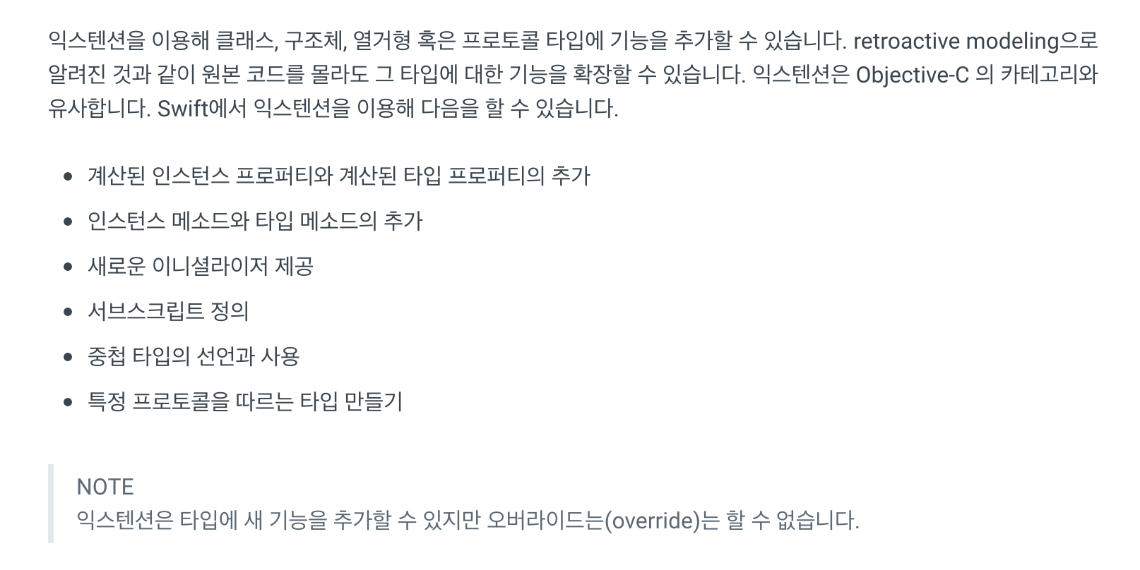 위 애플 가이드에서 "익스텐션은 타입에 새 기능을 추가할 수 있지만 Override는 할 수 없다." 라고 명시되어 있다. 하지만 개발을 하면서 Extension을 통해 Override는 사용 가능하다.